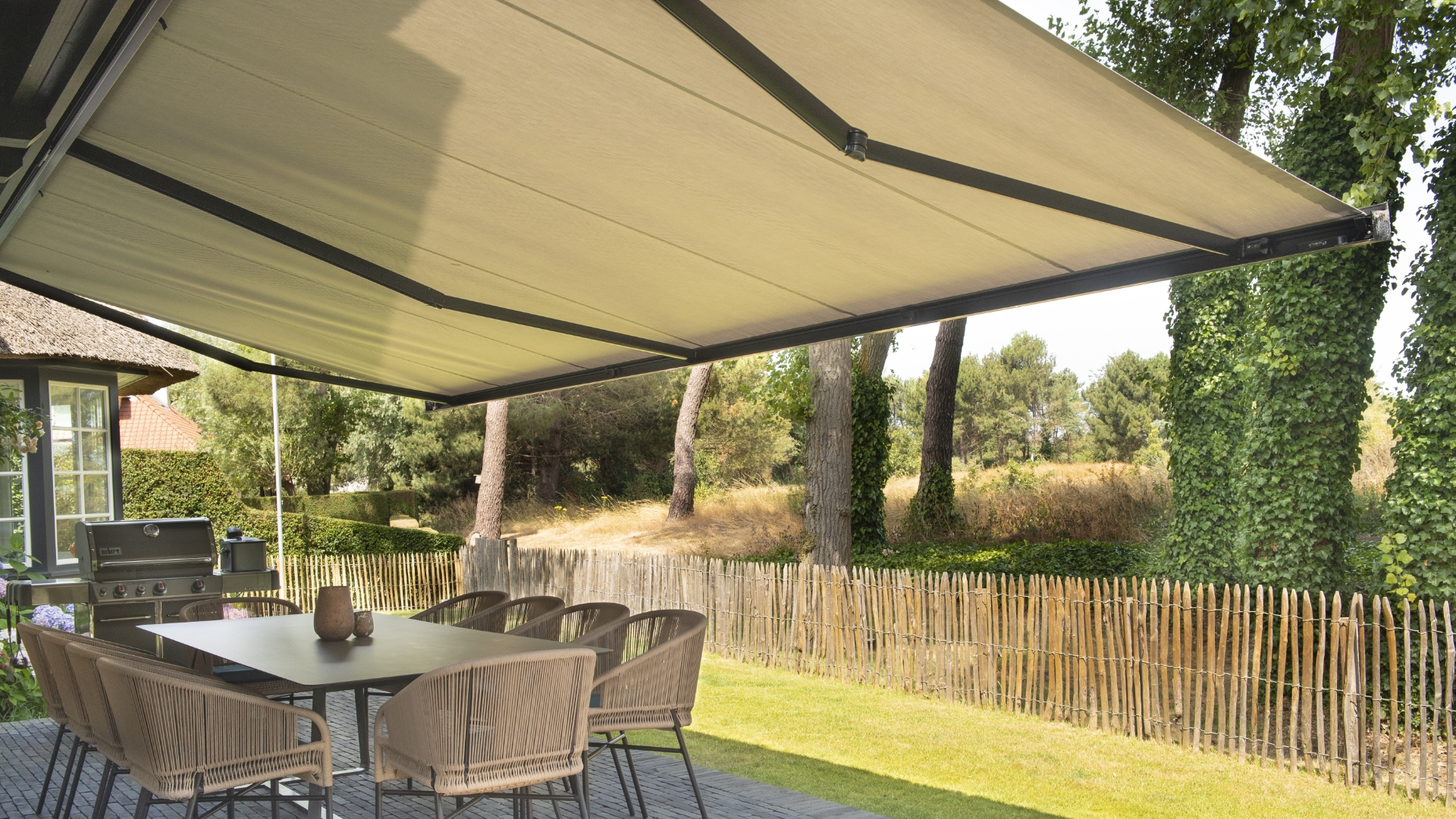 Le store banne est bien plus qu’un simple équipement de protection solaire. Il crée un véritable coin d’ombre à la demande, abritant du soleil, des rayons UV et même de petites averses. Il permet également de réguler naturellement la température à l’intérieur de la maison en limitant la chaleur qui entre par les baies vitrées.